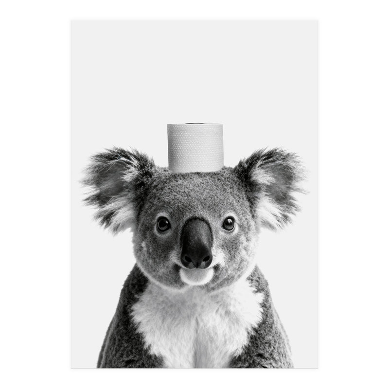 A playful illustration of a koala proudly wearing a toilet paper roll like a crown. Light-hearted, silly, and perfect for adding humor to a bathroom, kid’s room, or quirky home gallery wall.