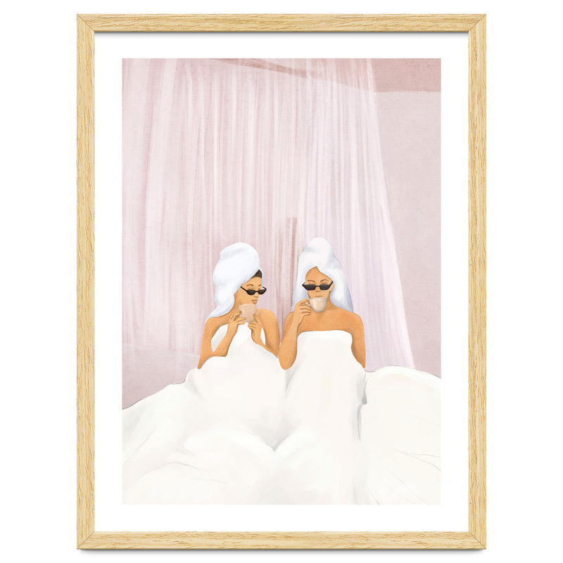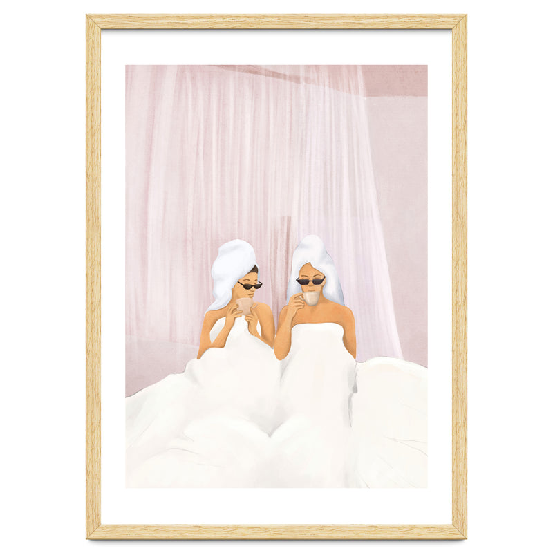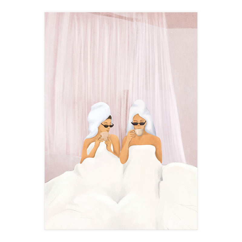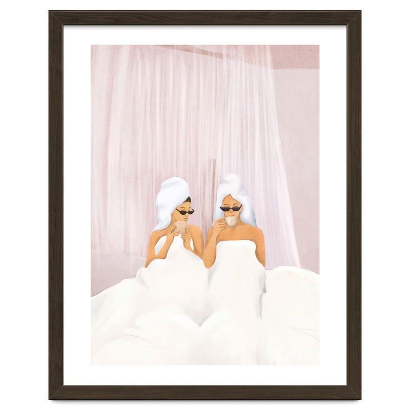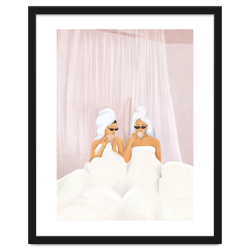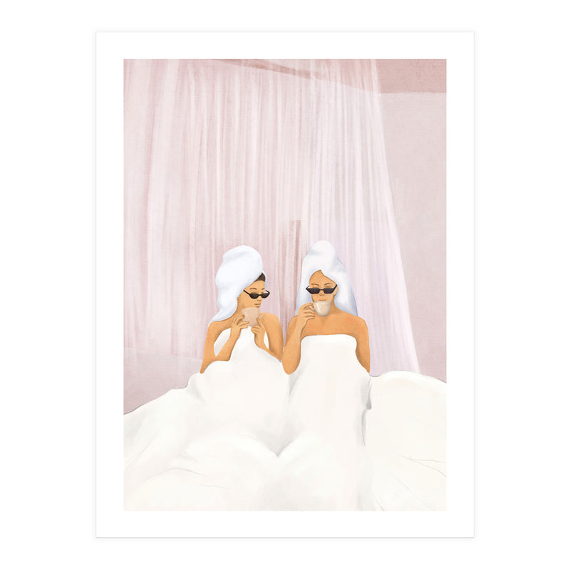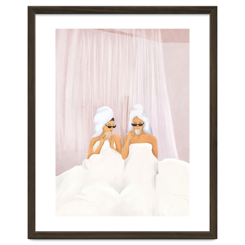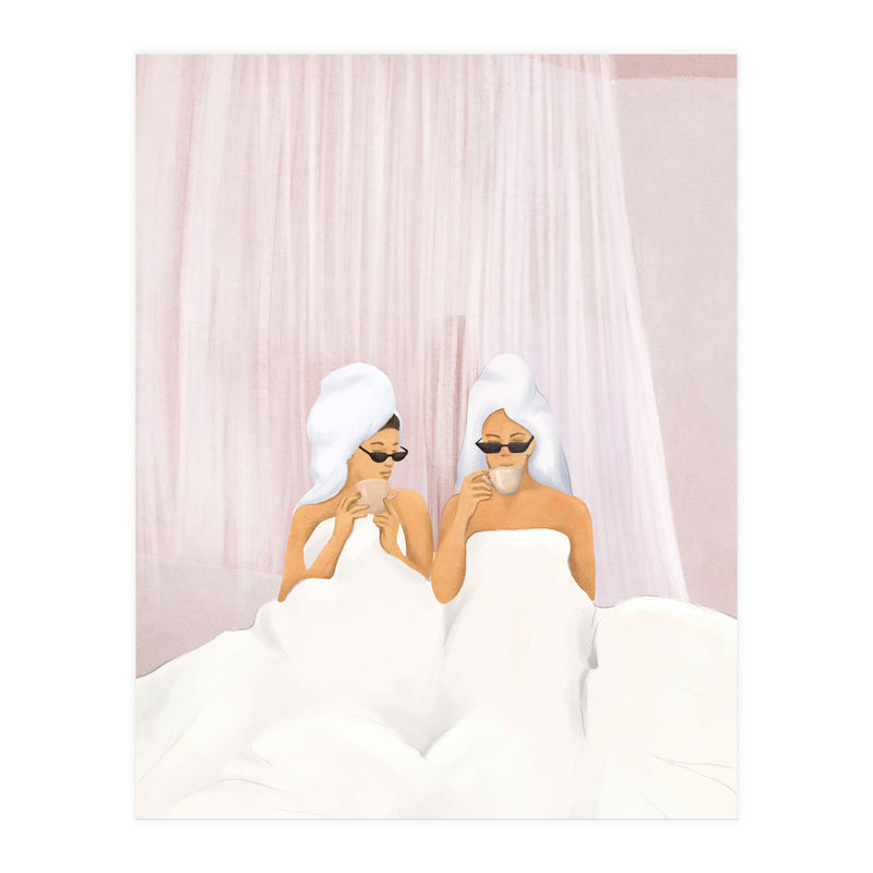 A soft, cozy illustration of two friends relaxing in bed, wrapped in white blankets with towels around their hair, wearing sunglasses and enjoying warm drinks. The pastel pink background and gentle textures create a calm, luxurious, self-care atmosphere perfect for lifestyle, wellness, and friendship-themed decor.