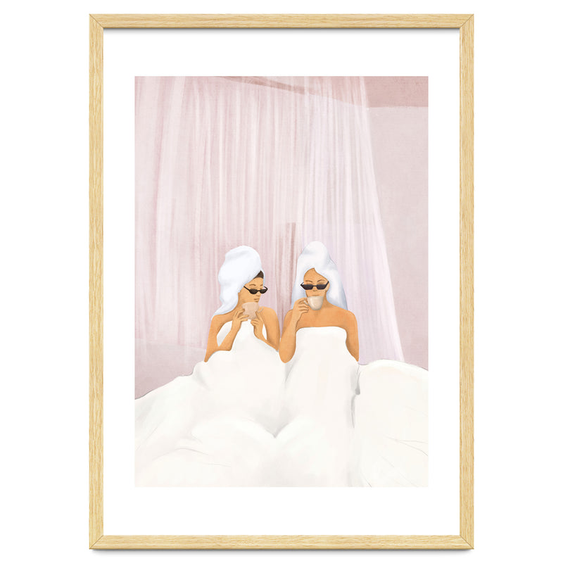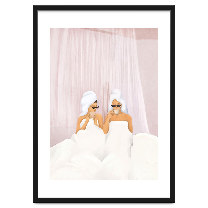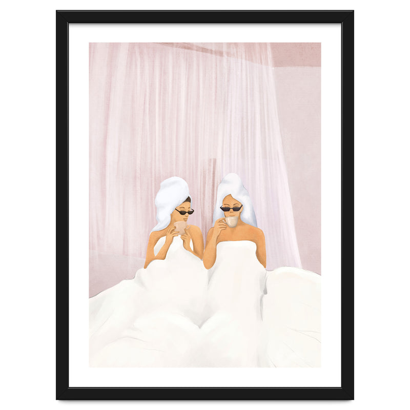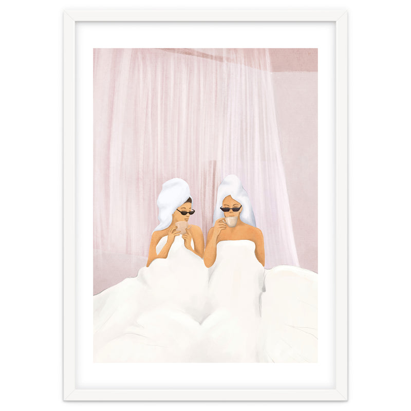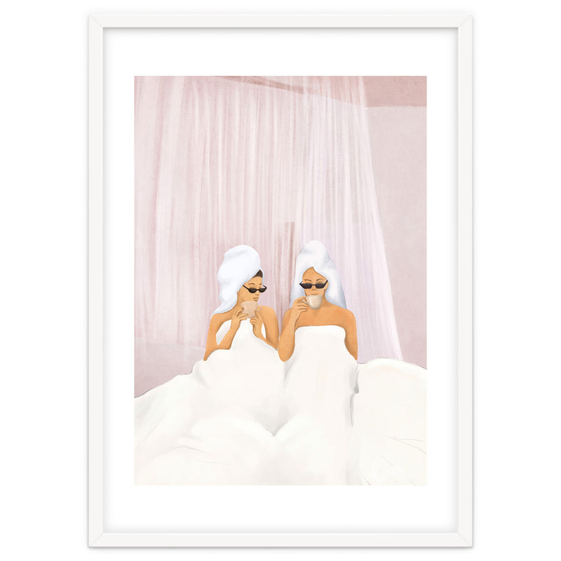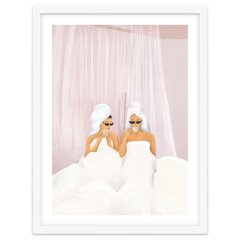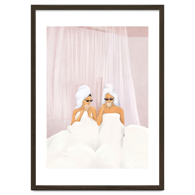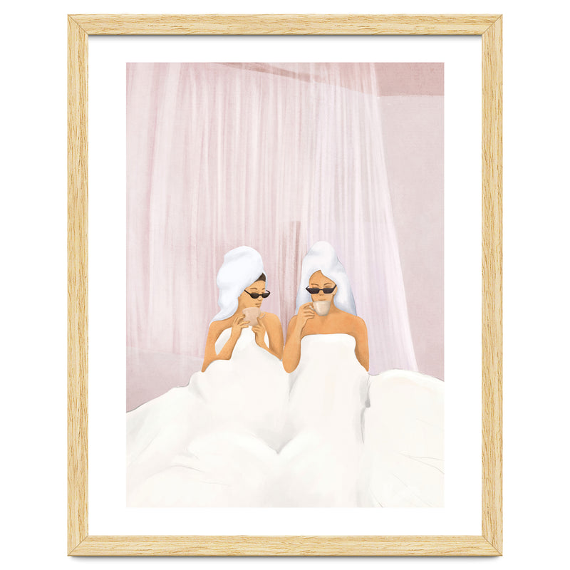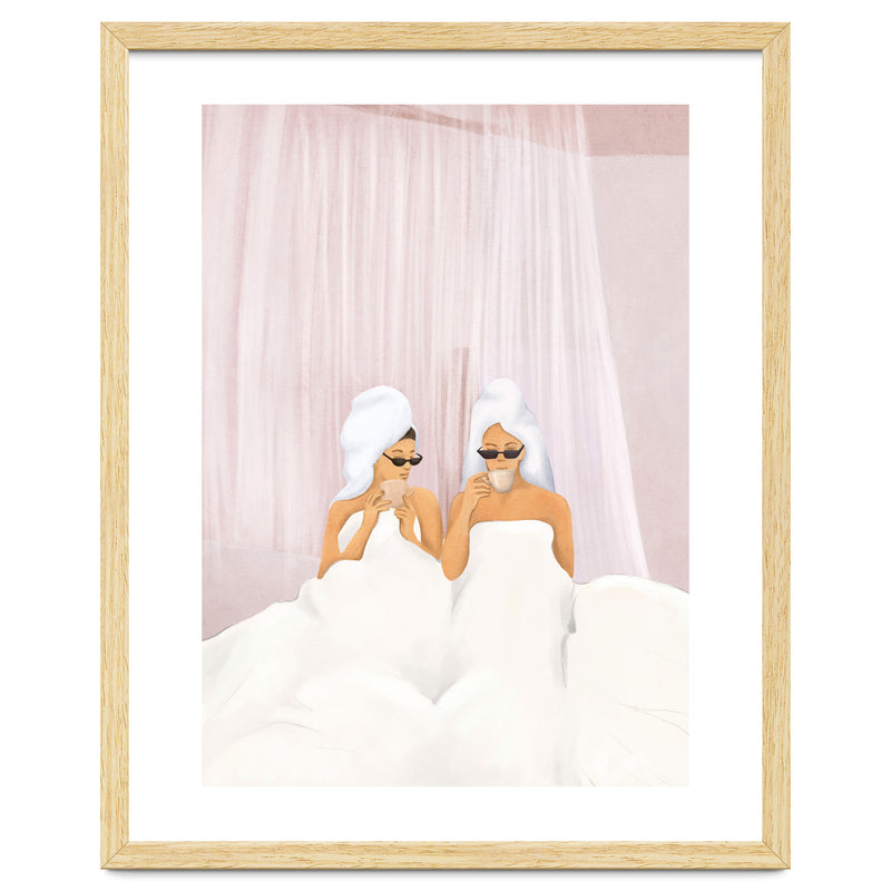 A soft, cozy illustration of two friends relaxing in bed, wrapped in white blankets with towels around their hair, wearing sunglasses and enjoying warm drinks. The pastel pink background and gentle textures create a calm, luxurious, self-care atmosphere perfect for lifestyle, wellness, and friendship-themed decor.
