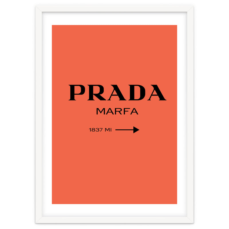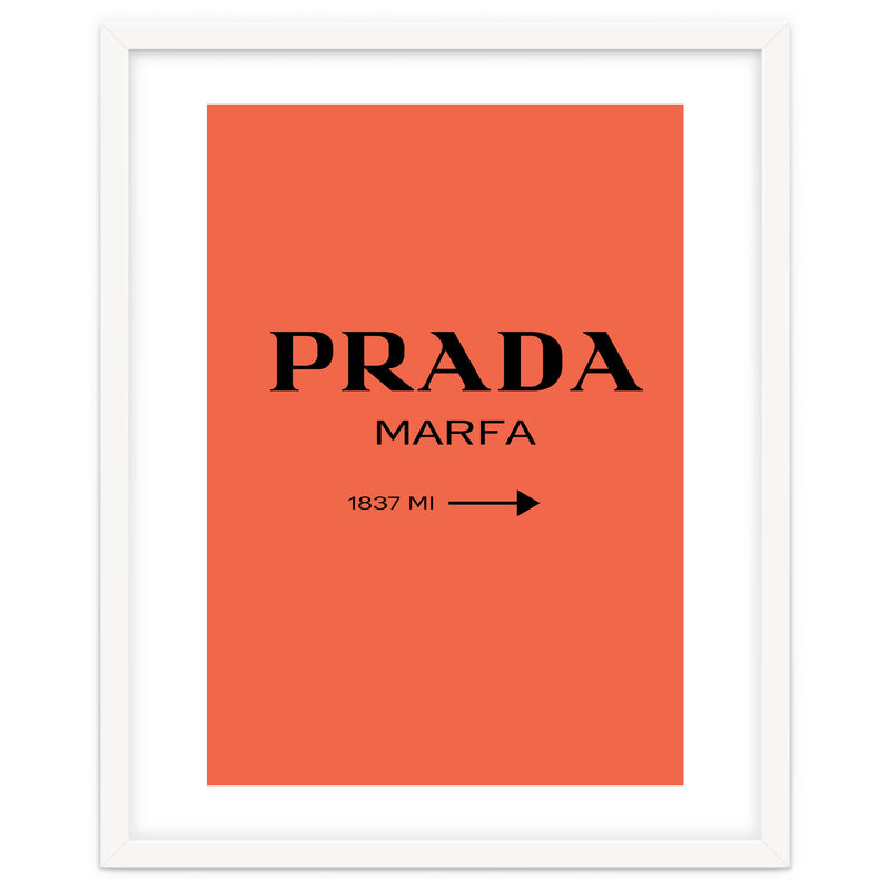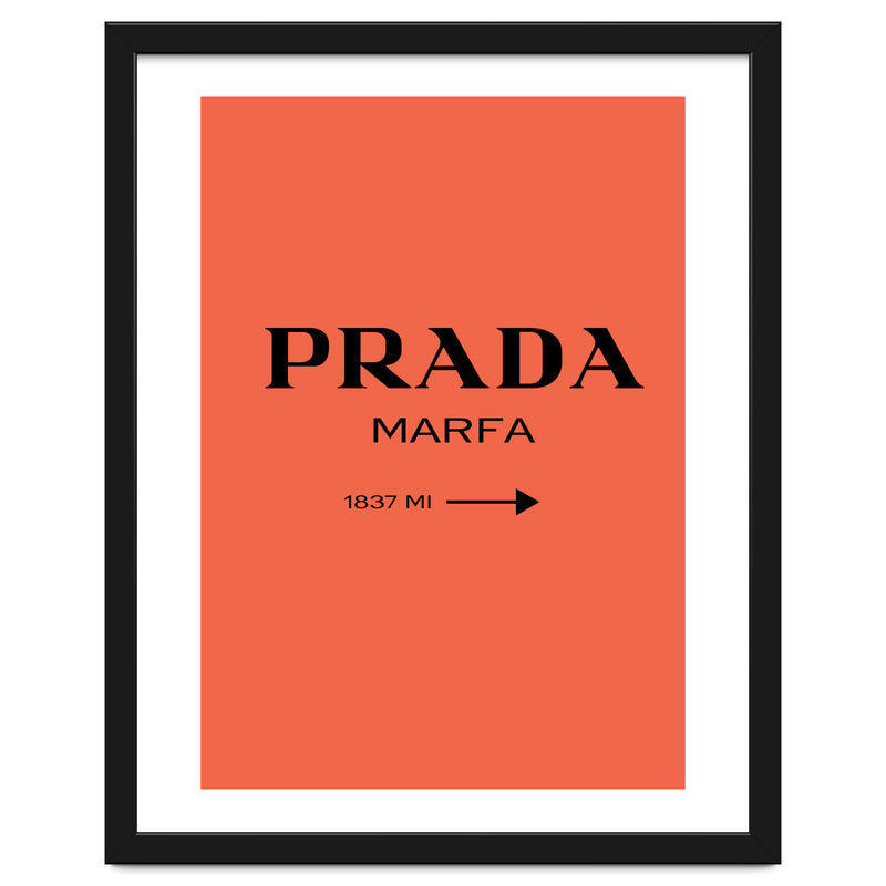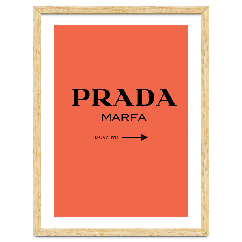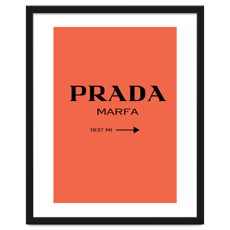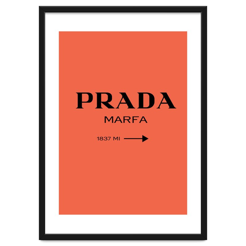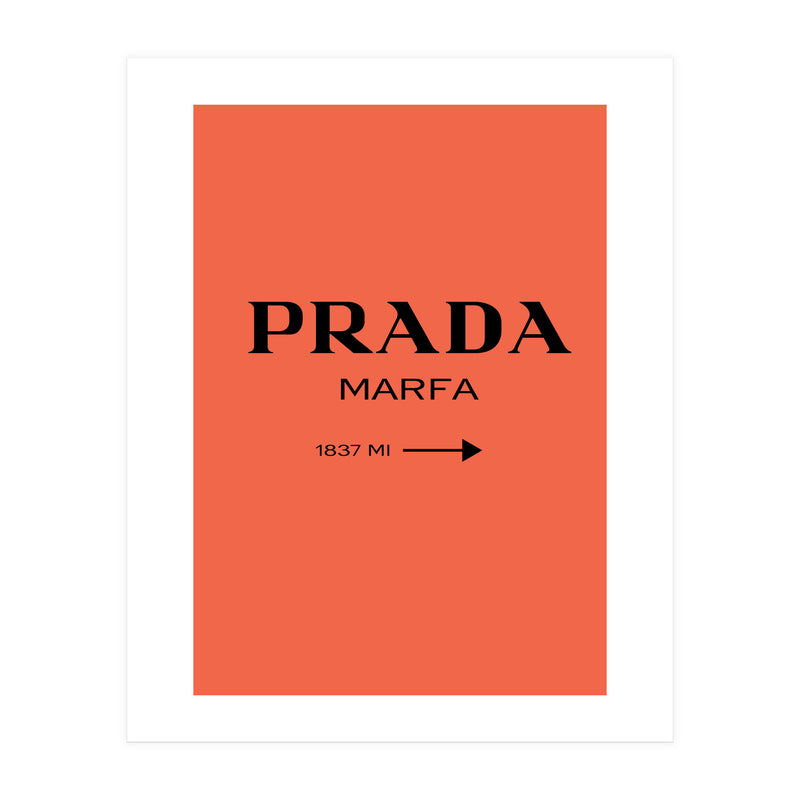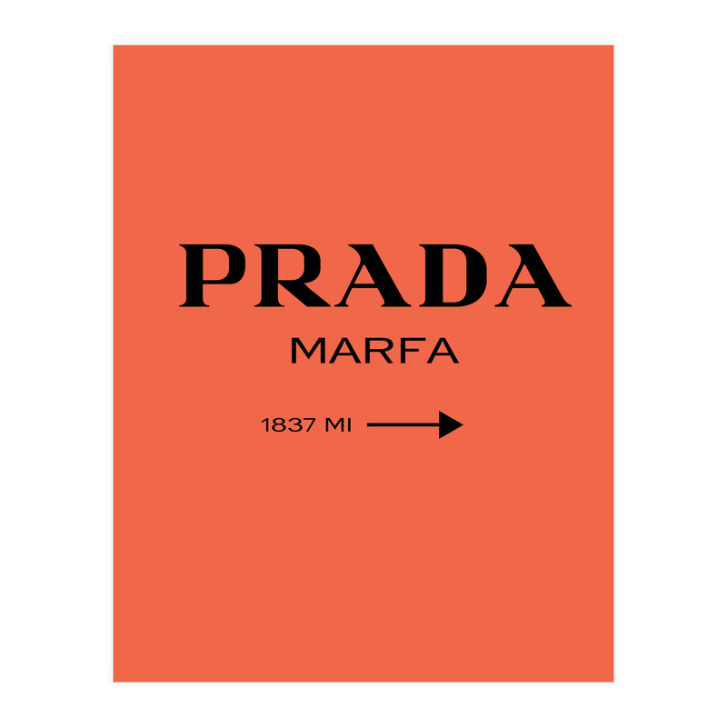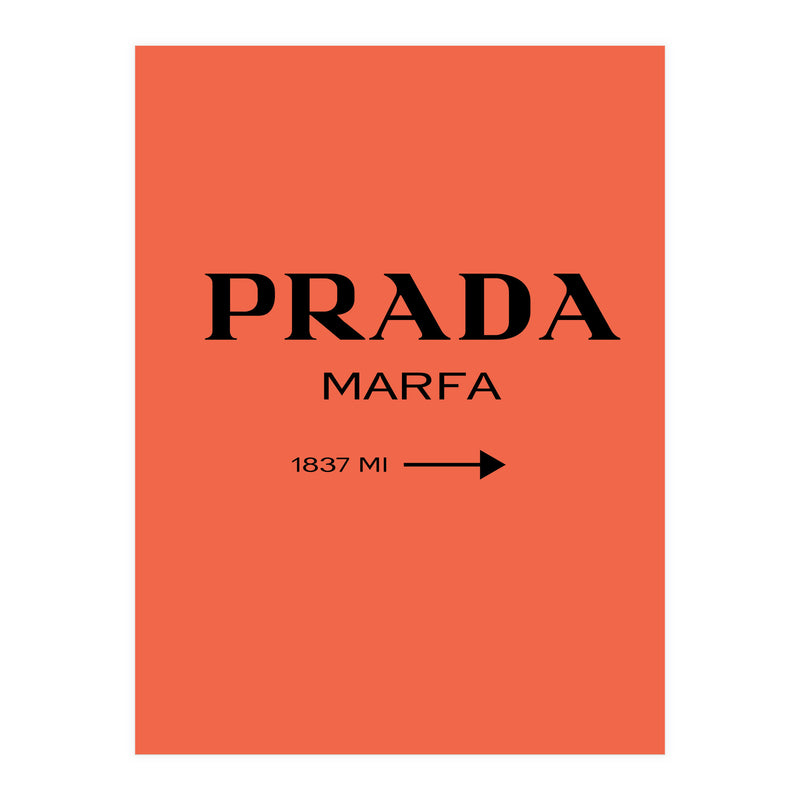 A bold and minimal “PRADA MARFA” sign on a bright coral background, with a clean arrow and distance. Simple, modern, and stylish. Looks perfect in bedrooms, closets, studios, or fashion spaces. Great for anyone who loves designer style and chic décor.