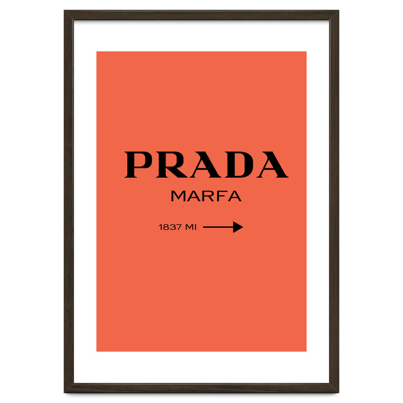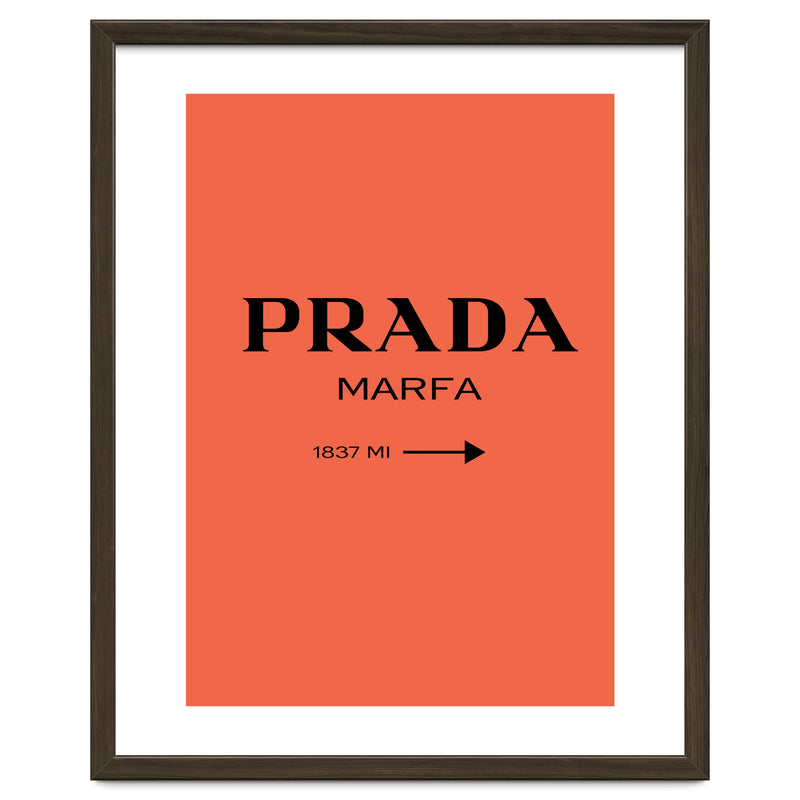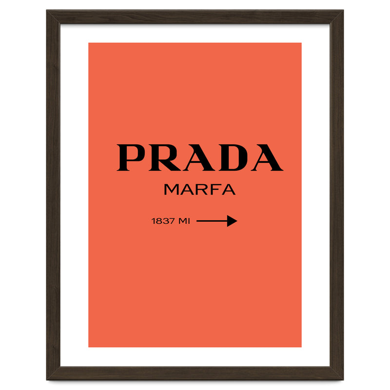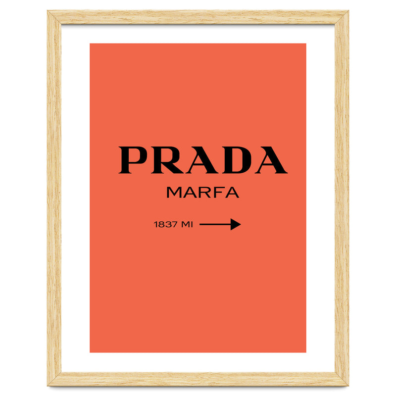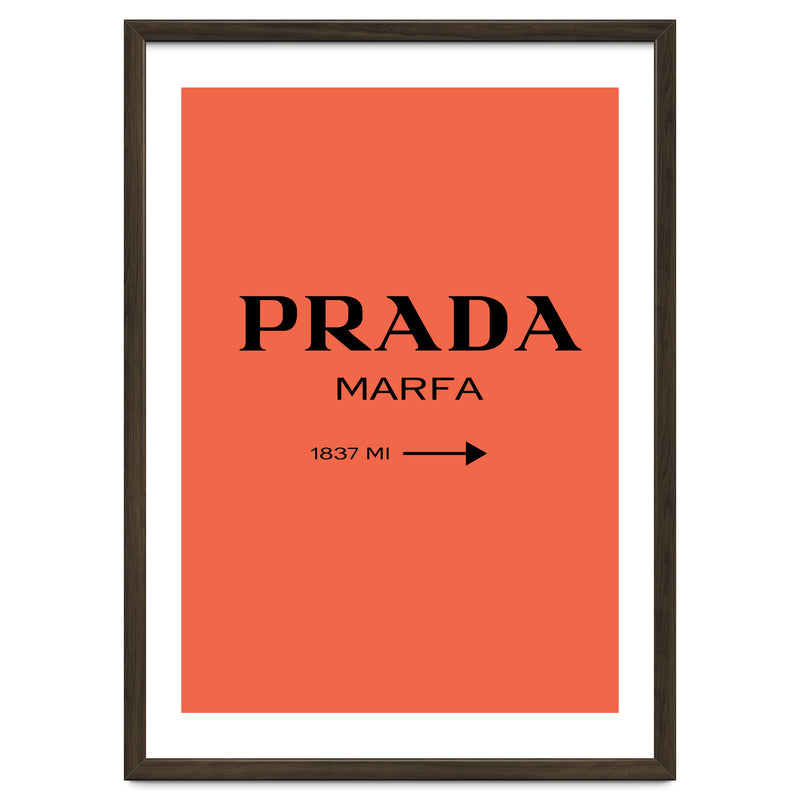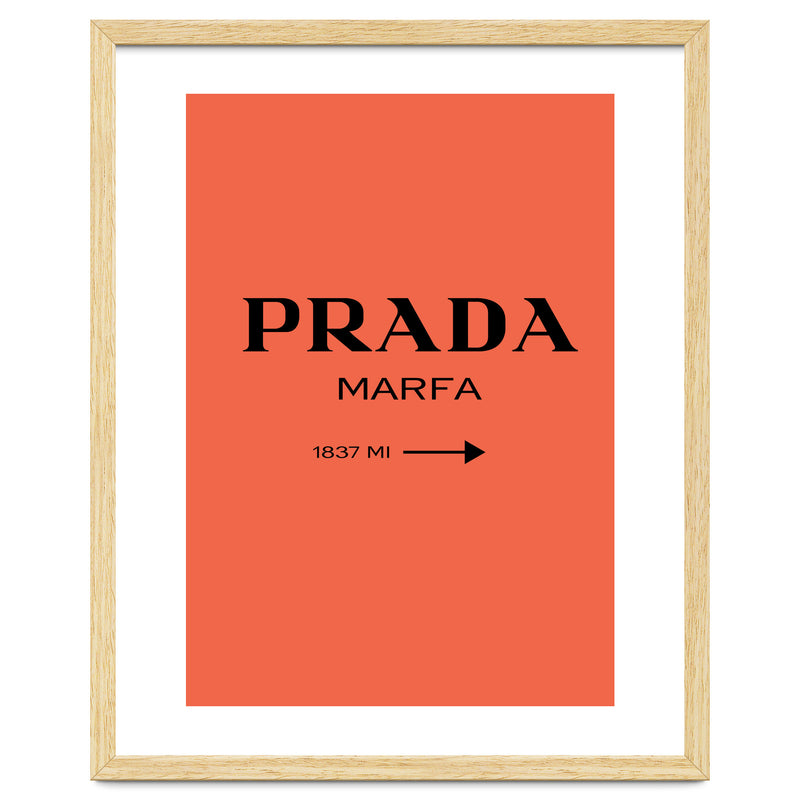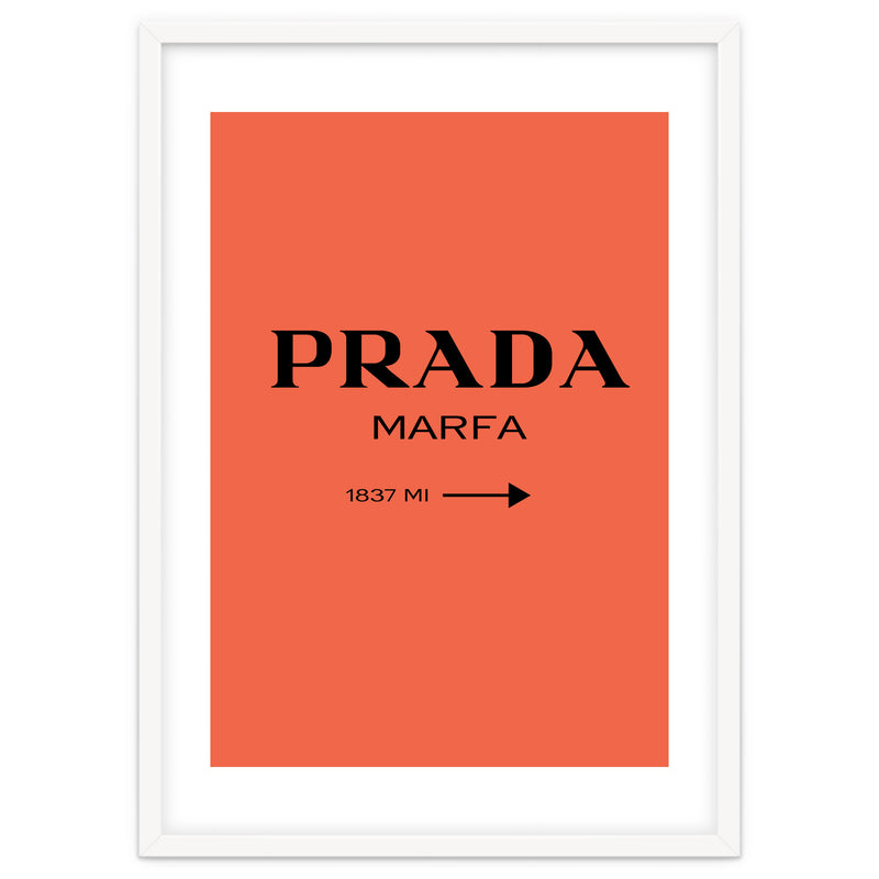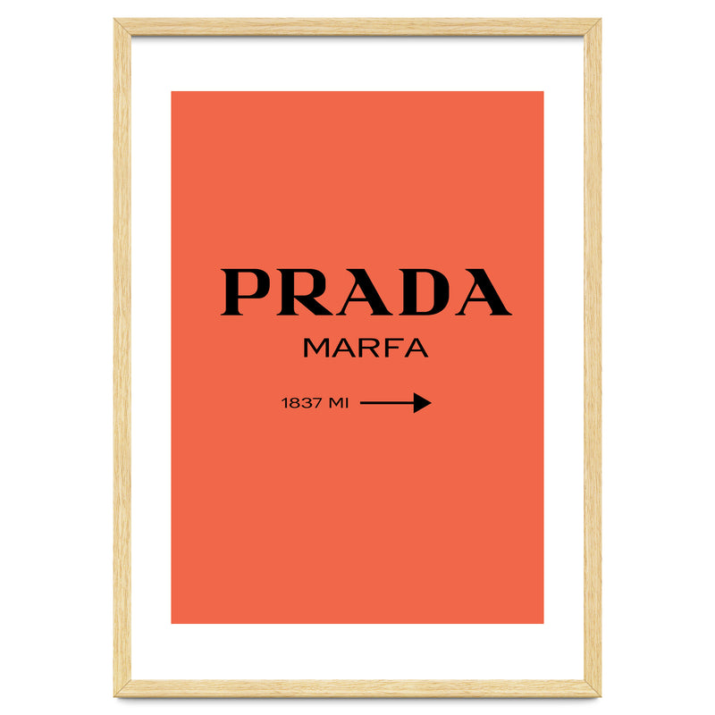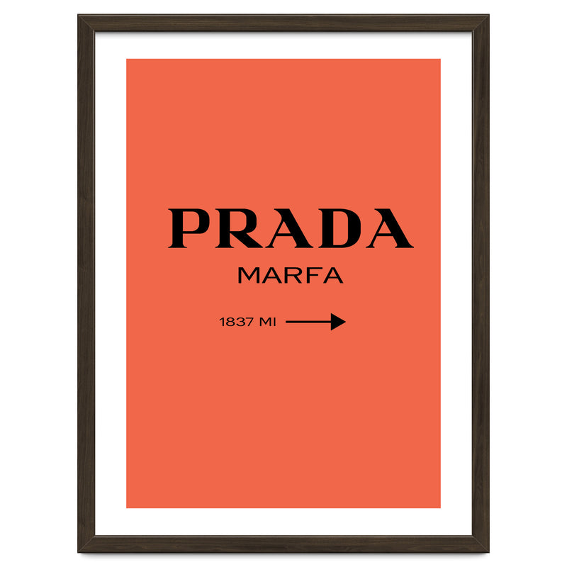 A bold and minimal “PRADA MARFA” sign on a bright coral background, with a clean arrow and distance. Simple, modern, and stylish. Looks perfect in bedrooms, closets, studios, or fashion spaces. Great for anyone who loves designer style and chic décor.