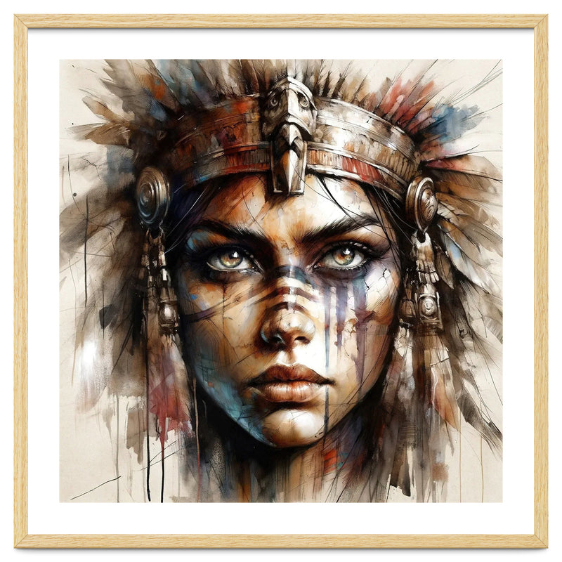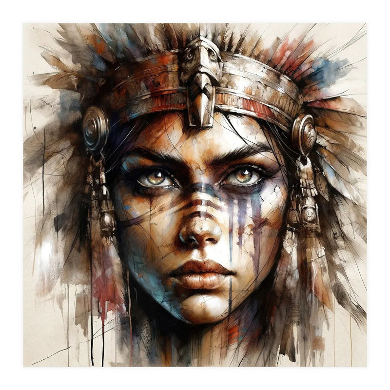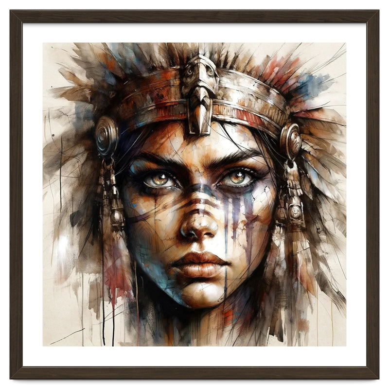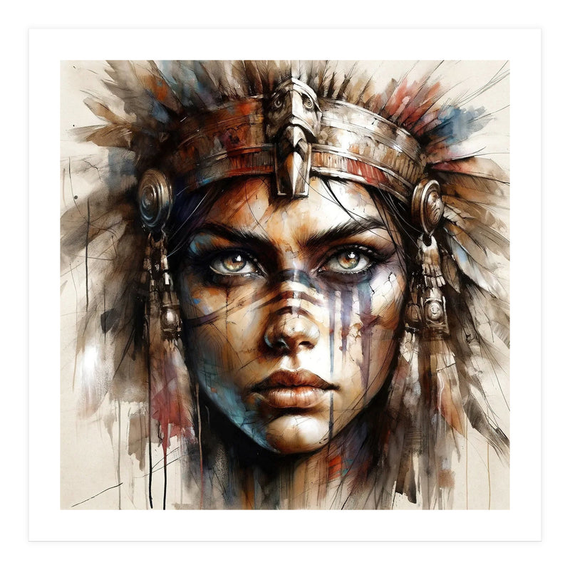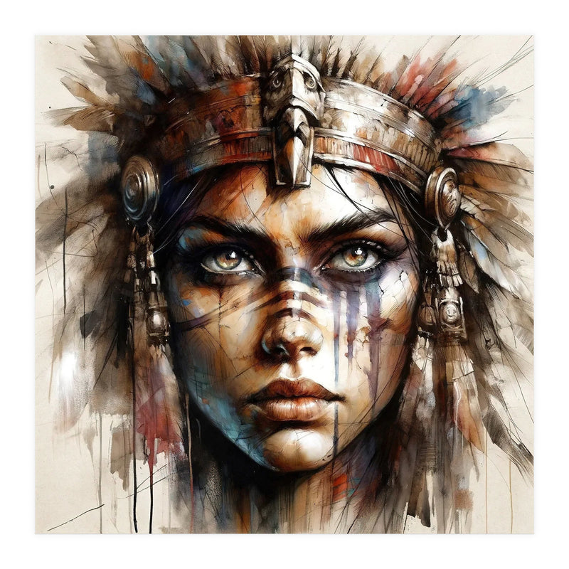 Close up watercolor portrait of a warrior woman wearing a metal headpiece with feather accents and subtle facepaint. Transparent washes reveal paper texture while controlled splashes and fine lines keep the gaze crisp, delivering a powerful contemporary focal point for modern interiors.