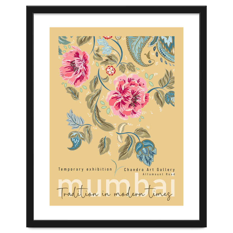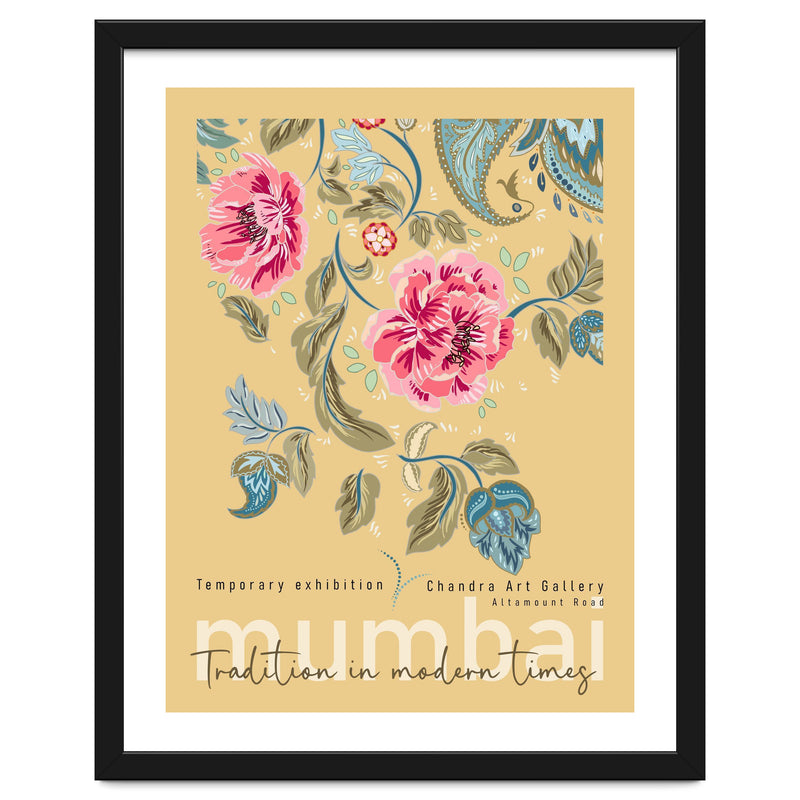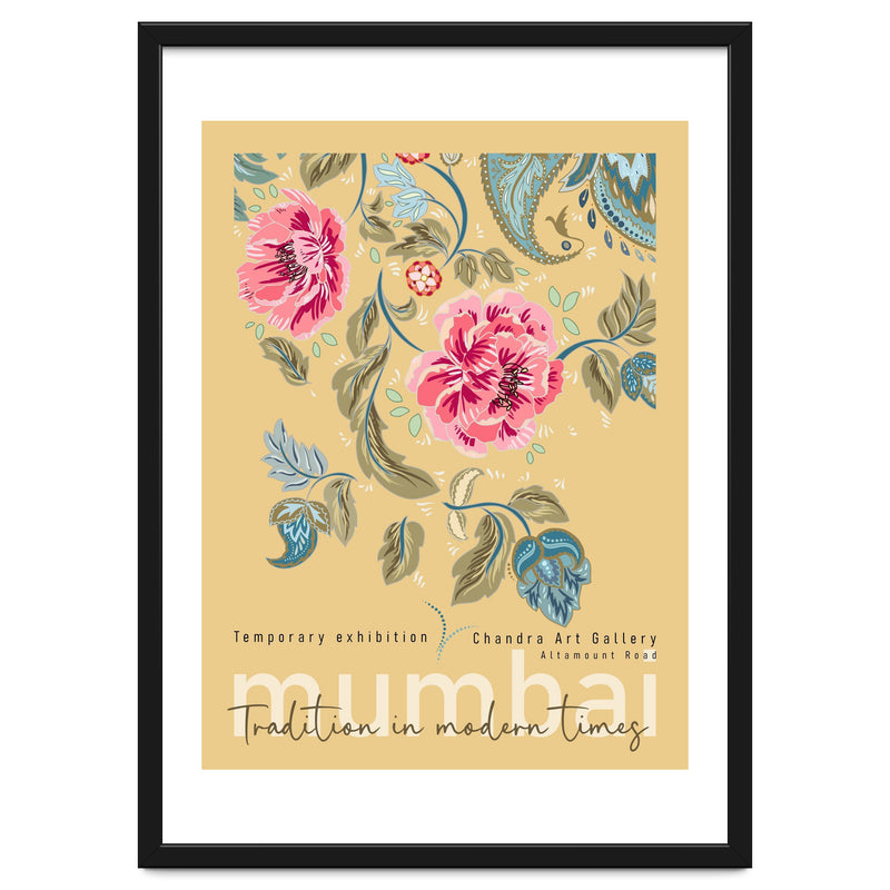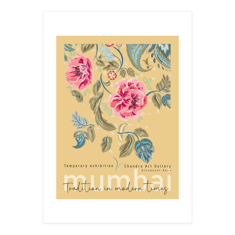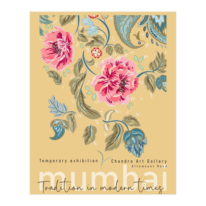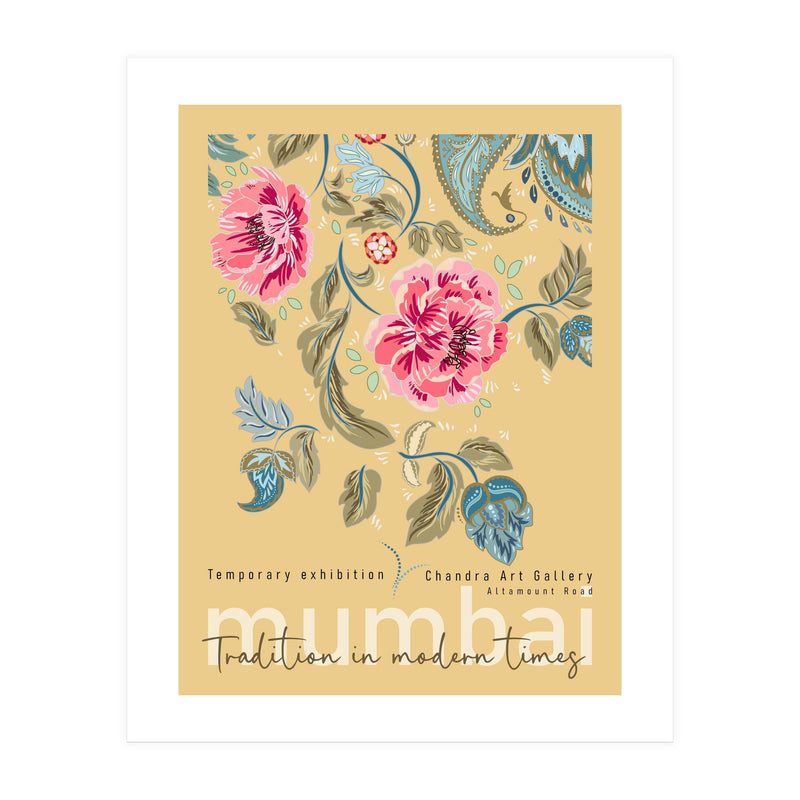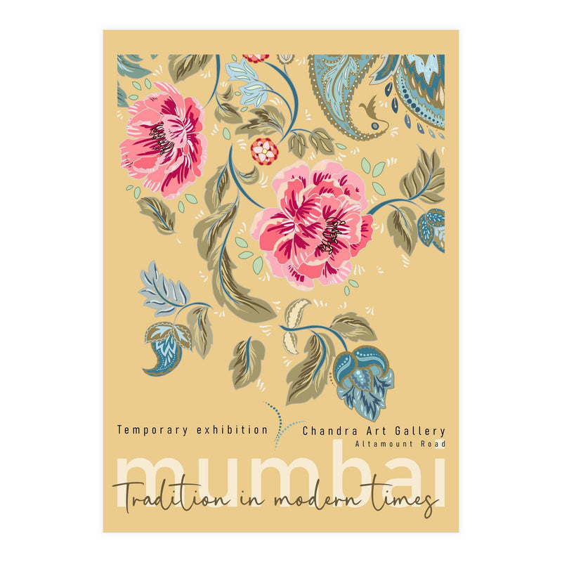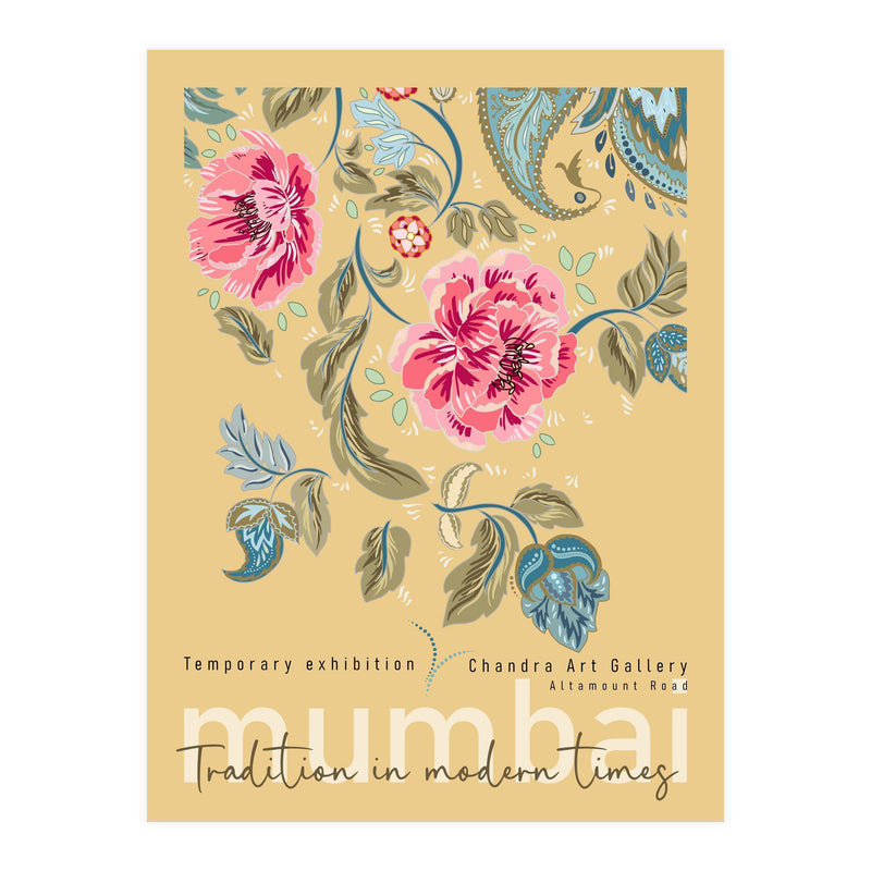 Tradition Meets Modernity: Mumbai's Chandra Art Gallery Exhibition Lush, traditional Indian floral pattern for an atmospheric and eye-catching exhibition poster. Motif from a retro poster collection for gallery events in major cities worldwide.