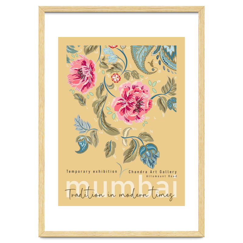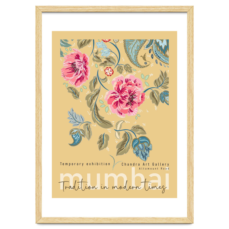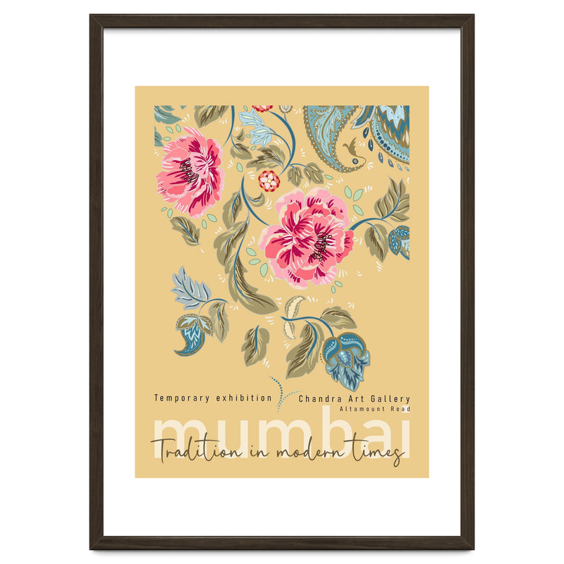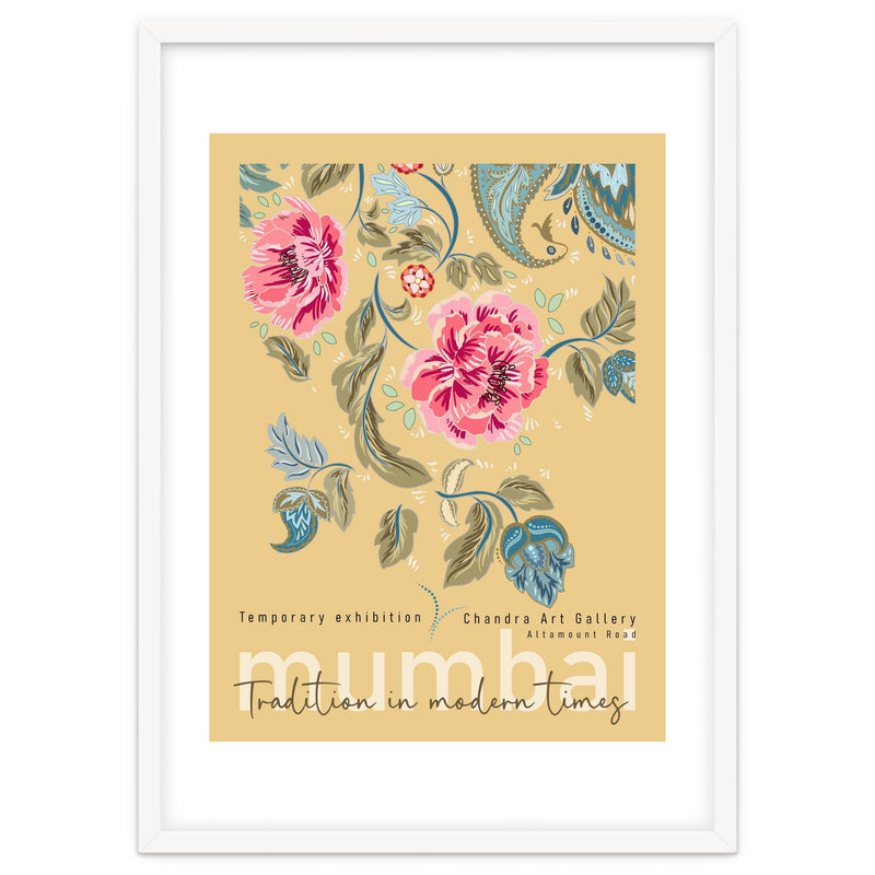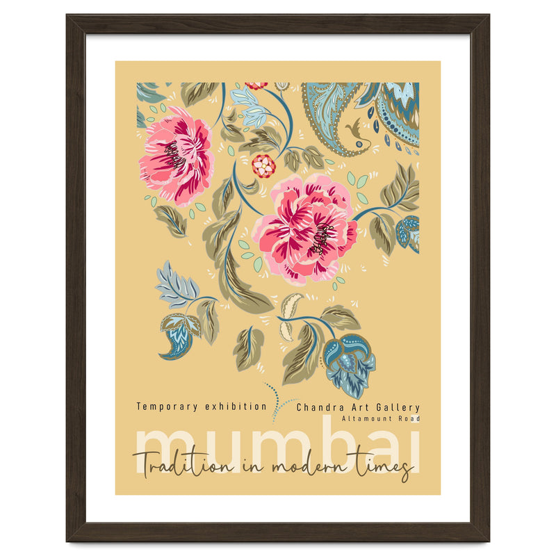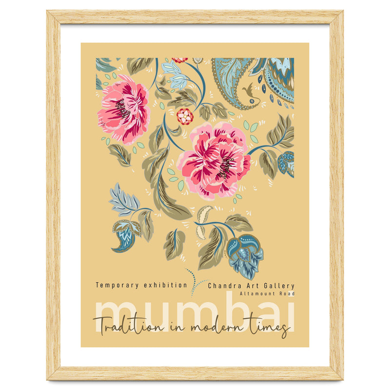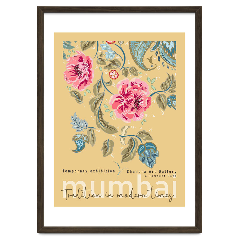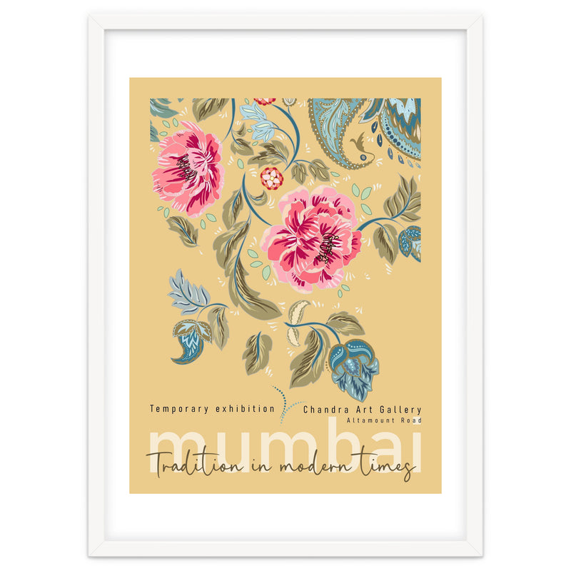 Tradition Meets Modernity: Mumbai's Chandra Art Gallery Exhibition Lush, traditional Indian floral pattern for an atmospheric and eye-catching exhibition poster. Motif from a retro poster collection for gallery events in major cities worldwide.